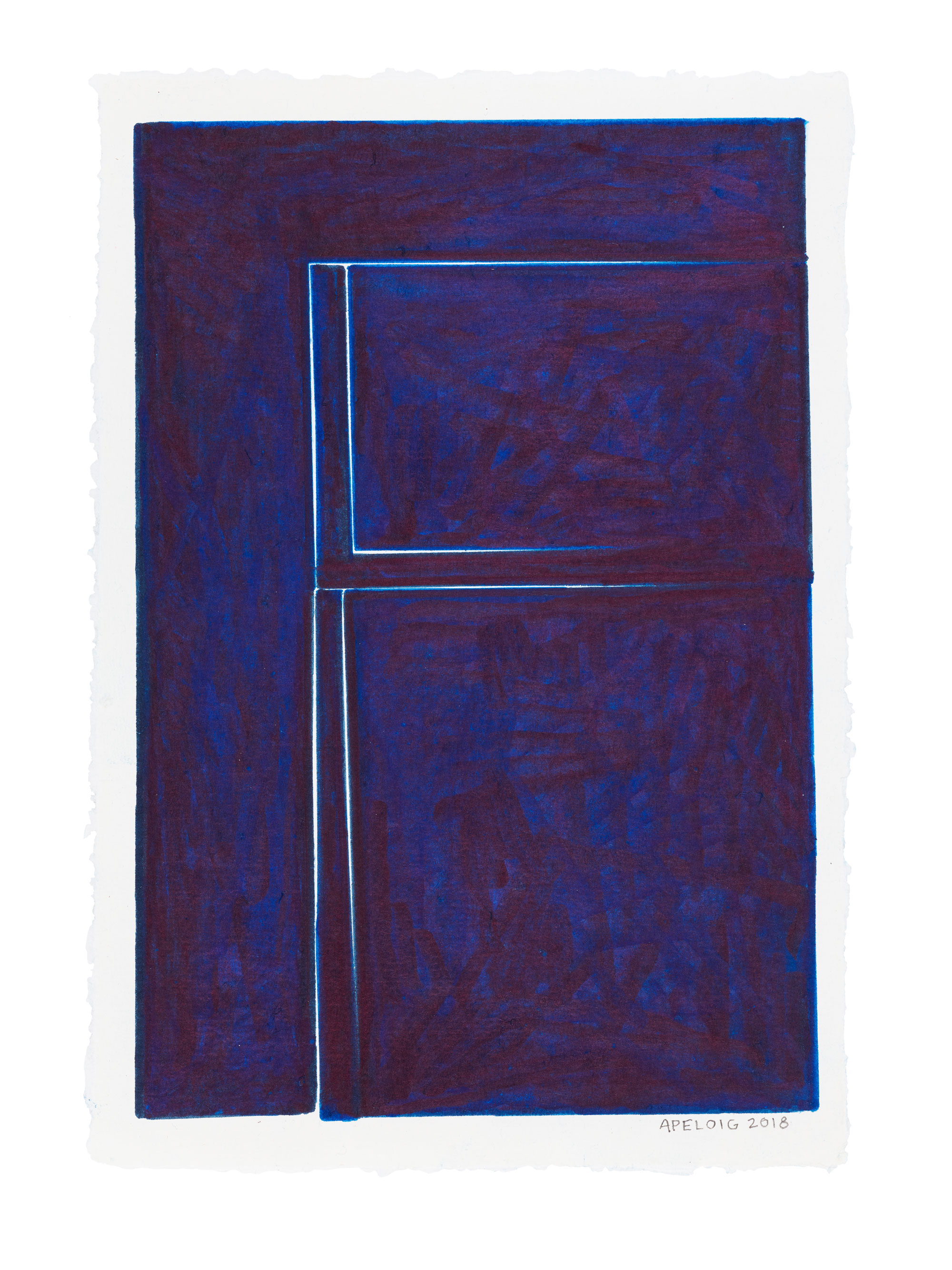 D’autre part, il y a une série d’aquarelles monochromes où émergent des lignes, des motifs, parfois des lettres. Tous sont issus d’incisions comme taillées au scalpel dans des aplats bleus aux subtiles nuances : indigo, de Prusse, céruléum, de Phtalo. Ces fentes laissent entrevoir le blanc du papier, et dessinent des lettres en négatif : c’est la réserve qui devient lumière.