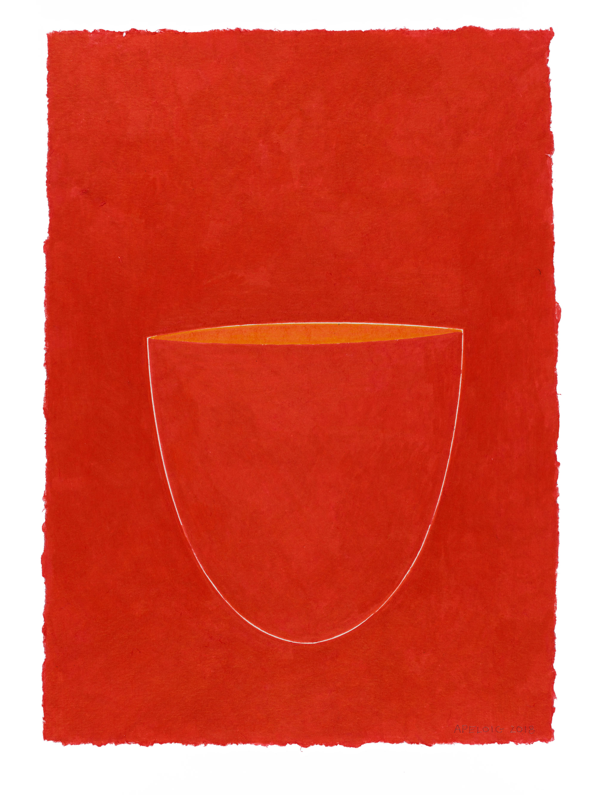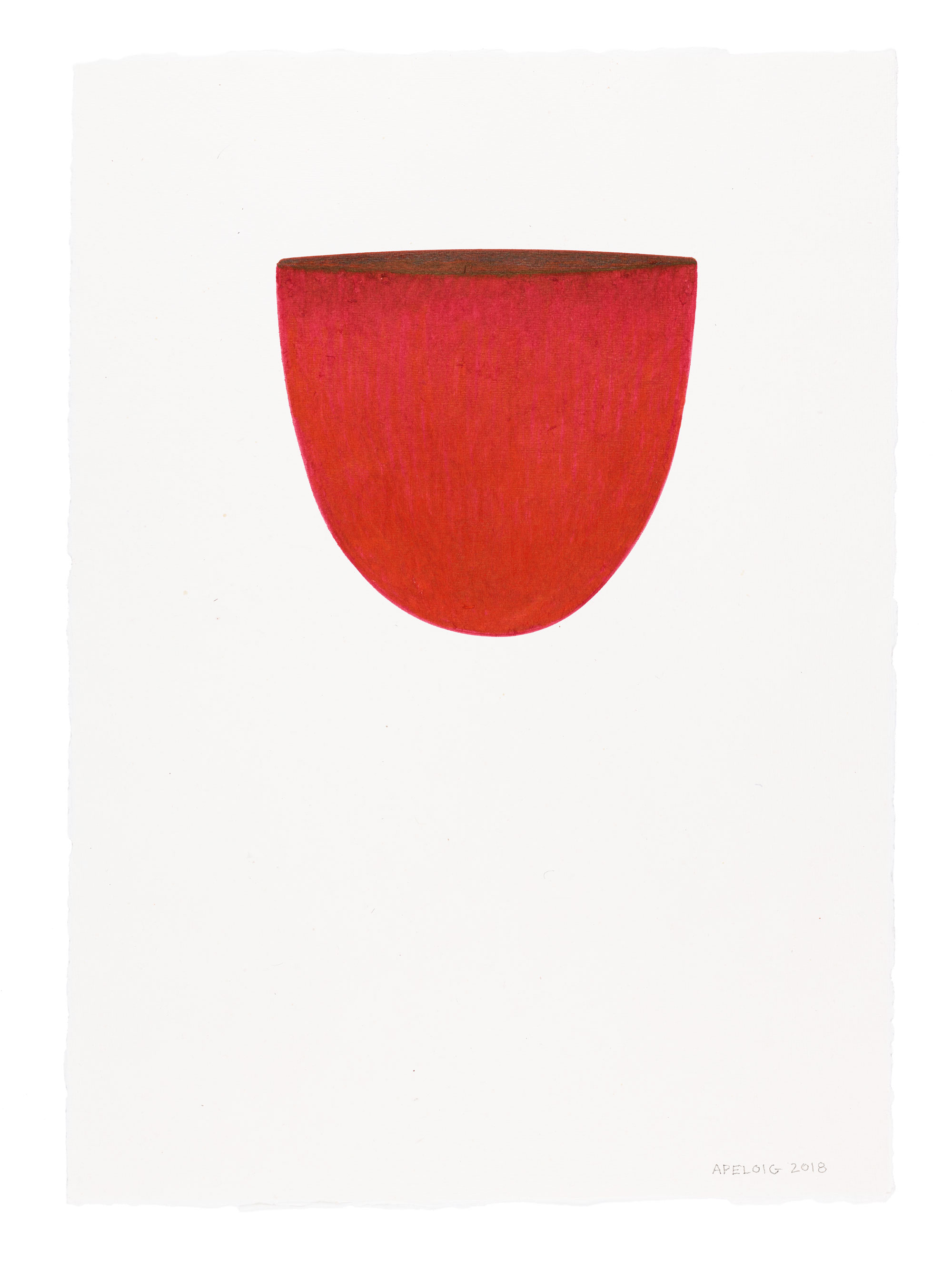 Les couleurs sont denses, au point que certaines fibres du papier imbibé de pigments ont été arrachées par les multiples passages du pinceau. L’objet est vu de face dans son évasement profilé, de dessus en un cercle parfait, parfois par dessous ou via un détail si rapproché que la matière de l’objet est un dégradé qui envahit l’espace entier de la page. Le dessin de la coupe se détache sur le fond blanc du papier, dont la texture granuleuse invite au toucher. Autrement, il n’en reste que le contour, qui disparaît presque et se fond dans des aplats.